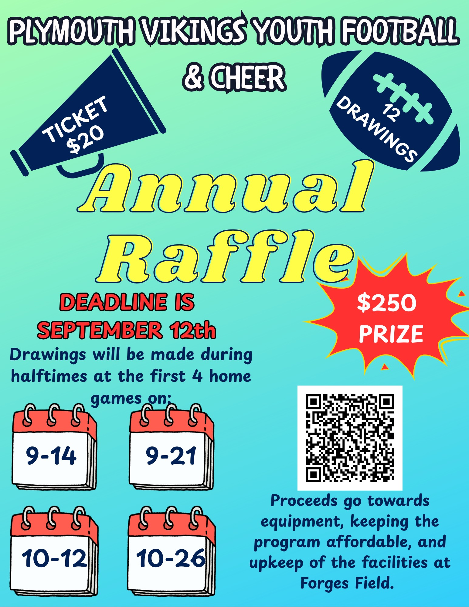 THREE $250 drawings will be held during halftime at each of our four Sunday home games. That gives each buyer 12 chances to win!! Winners do not have to be present. The deadline is September 12th.